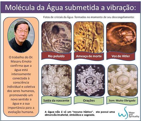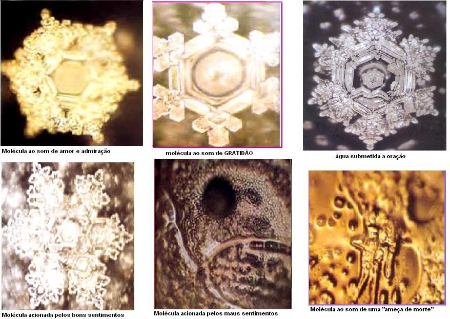 Contudo, uma das mais conhecidas relações entre a água e os nossos pensamentos/ emoções foi a pesquisa desenvolvida por Masaru Emoto, a qual ele nomeou de “Memórias da Água”. A seguir, você pode ter uma ideia do quanto a forma harmônica ou desarmônica das moléculas de água, assim como a vibração e a sua tonalidade – que foram congeladas e colocadas em um microscópio – falam mais do que mil palavras. Ao longo de décadas, outros inúmeros testes foram realizados, inclusive com alimentos e outros materiais orgânicos. Atualmente, um ramo que estuda diferentes frequências de som na água e em materiais líquidos e sólidos é a Cimática.