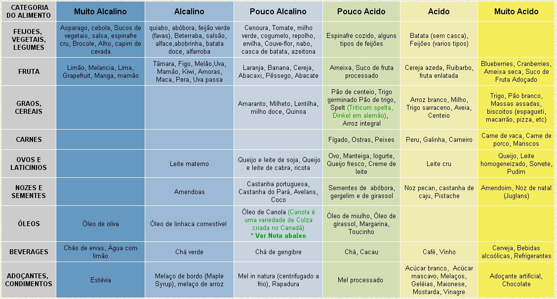 Para complementar o assunto, relaciono abaixo uma tabela que pode trazer mais esclarecimento quanto aos alimentos ácidos e alcalinos. Tendo por base esse conhecimento, uma premissa da alimentação desintoxicante que mais do que curativa é preventiva, concluímos que quanto mais alcalino nosso organismo, menos suscetíveis estaremos a doenças e problemas de saúde futuros. Cabe ressaltar que essa alcalinidade não se resume apenas aos alimentos, mas também às nossas atitudes, pensamentos e sentimentos. Entretanto, alimentar-se conscientemente é o primeiro passo.