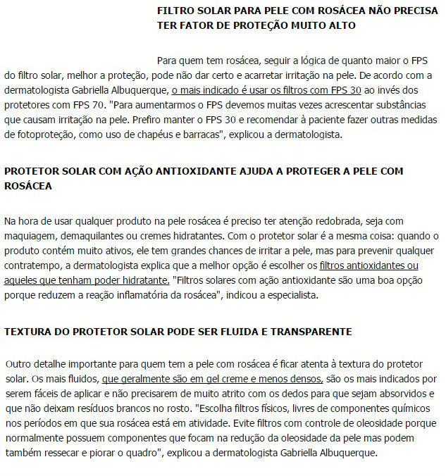 - A aplicação de um protetor solar – principalmente se houver maior exposição ao sol – é fundamental. O ideal é solicitar que o próprio dermatologista manipule o mais adequado à condição da sua pele, sendo o FPS 30 suficiente e melhor para evitar maios irritação que os fatores de maior grau podem provocar *