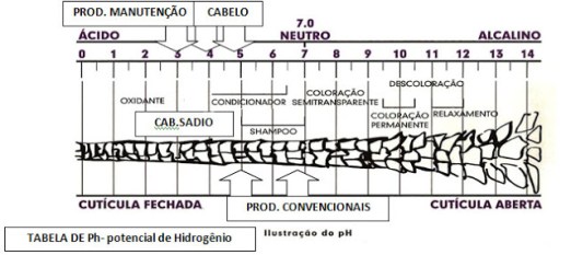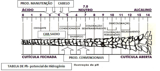 Os cosméticos capilares com Ph alcalino são usados para modificar a estrutura externa e interna dos cabelos, abrindo as cutículas a fim de penetrar nos fios. O Ph ácido reforça a fibra capilar, age como adstringentes e neutraliza os tratamentos feitos com cosméticos alcalinos. Ao utilizarmos produtos muito ácidos (pH entre 1 e 2), assim como produtos muito alcalinos (pH acima de 10), os cabelos “incham”, pois as cutículas se abrem e é desta forma que os tratamentos químicos – alisamentos, permanentes e colorações – são mais eficazes.