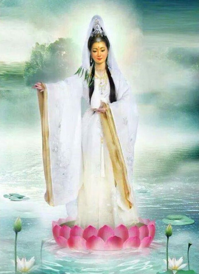 Bodhisatva Guan Yin foi consagrada universalmente nas diversas correntes budistas como principal figura da devoção. Era Bodhisatva Avalokitesvara, aquela que praticava profundamente o Prajna Paramitta – a sabedoria – até libertar-se de todo sofrimento. Não é vista como uma deusa porque guarda traços humanos. Conta-se, na tradição popular, que ela foi uma princesa na antiga Índia. Era a mais bela e piedosa entre todas; não gostava de vestidos luxuosos, nem de pratos finos feitos com carnes de animais, embora tudo isso lhe fosse oferecido como direito. Alimentava-se de verduras porque não suportava ver animais sendo mortos; vestia-se de panos grossos porque gostava de ser simples, e era a mais piedosa entre as filhas.