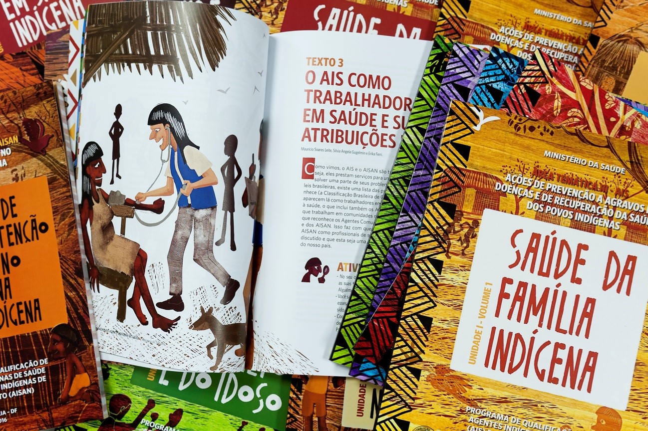 O trabalho relativo à saúde indígena faz parte das Práticas Integrativas e Complementares em Saúde. São 16 cadernos temáticos que compõem o material didático do Programa de Formação de Agentes Indígenas de Saúde e de Saneamento. Todos estão disponíveis para baixar gratuitamente – acesse link no final do artigo – contendo um compilado de conhecimentos de vários povos indígenas brasileiros, informações técnicas e científicas de saúde, incluindo ilustrações artísticas coloridas que incentivam e alegram a leitura.