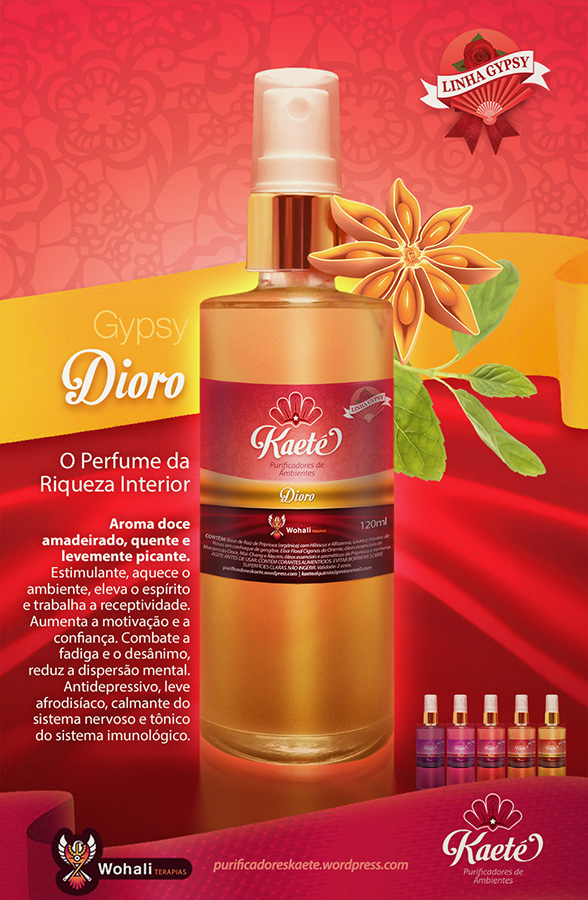 DIORO – O Perfume da Riqueza Interior: AROMA DOCE AMADEIRADO, QUENTE E LEVEMENTE PICANTE. Estimulante, aquece o ambiente, eleva o espírito e trabalha a receptividade. Aumenta a motivação e a confiança. Combate a fadiga e o desânimo, reduz a dispersão mental. Antidepressivo, leve afrodisíaco, calmante do sistema nervoso e tônico do sistema imunológico. Contém: Base Alcoólica de Raiz de Priprioca (orgânica) com Hibiscus e Alfazema, Louro e Pétalas de Rosas. Elixir Floral Ciganas do Oriente, óleos essenciais de Gengibre, Anis Estrelado e Sândalo, e óleos aromáticos de Priprioca, Madeira do Oriente e Flor de Laranjeira.
