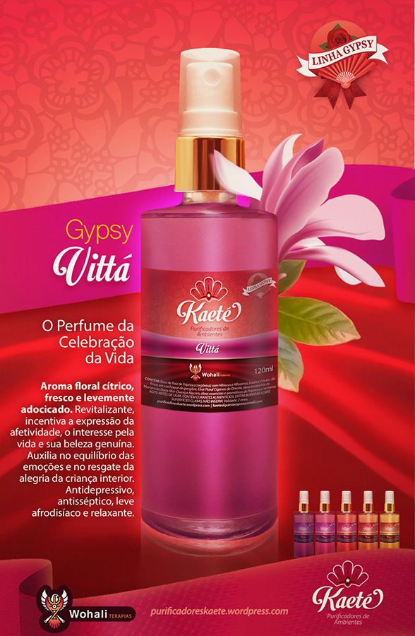 VITTÁ – O Perfume da Celebração da Vida: AROMA FLORAL CÍTRICO, FRESCO E LEVEMENTE ADOCICADO. Revitalizante, incentiva a expressão da afetividade, o interesse pela vida e sua beleza genuína. Auxilia no equilíbrio das emoções e no resgate da alegria da criança interior. Antidepressivo, antisséptico, leve afrodisíaco e relaxante. Contém: Base Alcoólica de Raiz de Priprioca (orgânica) com Hibiscus e Alfazema, Louro e Pétalas de Rosas. Elixir Floral Ciganas do Oriente, óleos essenciais de Laranja Doce, Ylang Ylang e Anis Estrelado, e óleos essenciais e aromáticos de Priprioca, Absinto e Dama da Noite (Gardênia).